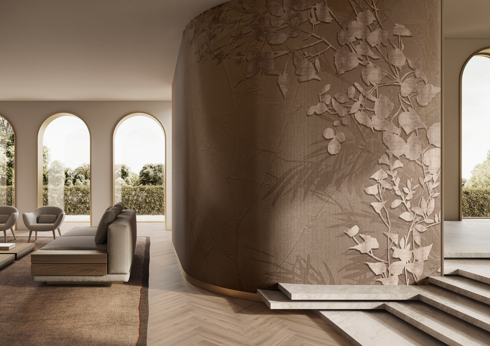 Tapeta GlamSatin je vyrobena ze speciálně vyvinutého materiálu, který zaujme svým nenápadným luxusem a leskem. Na neutrálním pozadí zemitých tónů ožívají botanické vzory v odstínech zlata, mosazi a platiny. Opulentní tropická zeleň, okvětní lístky a světlé rozkvetlé větve dodávají vnitřním prostorům jemnou a povzbuzující auru. Perleťový povrchivá úprava připomíná zářivý třpyt hedvábí. Speciální embosování odráží světlo, takže každý výtvarný prvek získává další vizuální rozměr.