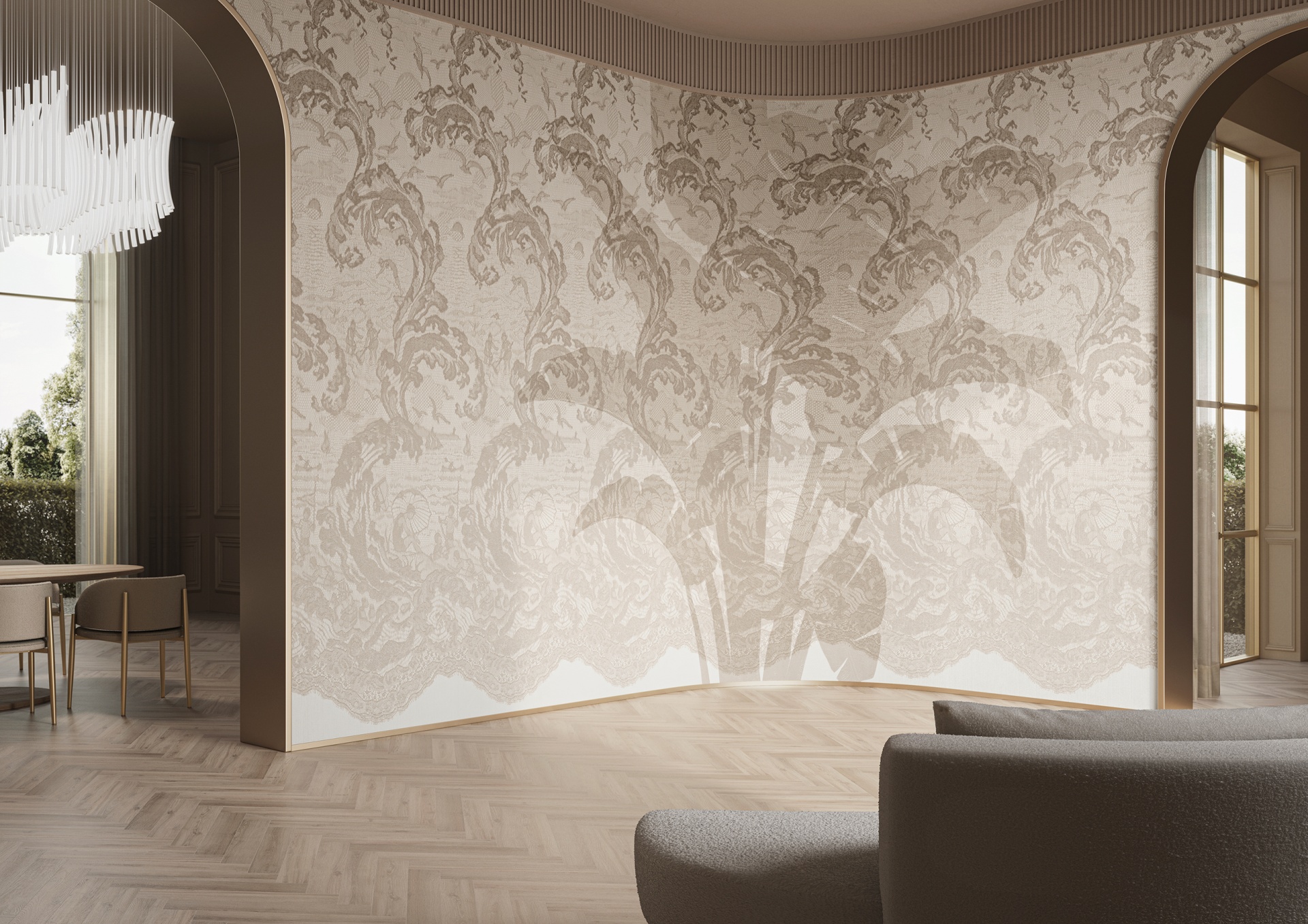 Tapeta GlamSatin je vyrobena ze speciálně vyvinutého materiálu, který zaujme svým nenápadným luxusem a leskem. Na neutrálním pozadí zemitých tónů ožívají botanické vzory v odstínech zlata, mosazi a platiny. Opulentní tropická zeleň, okvětní lístky a světlé rozkvetlé větve dodávají vnitřním prostorům jemnou a povzbuzující auru. Perleťový povrchivá úprava připomíná zářivý třpyt hedvábí. Speciální embosování odráží světlo, takže každý výtvarný prvek získává další vizuální rozměr.