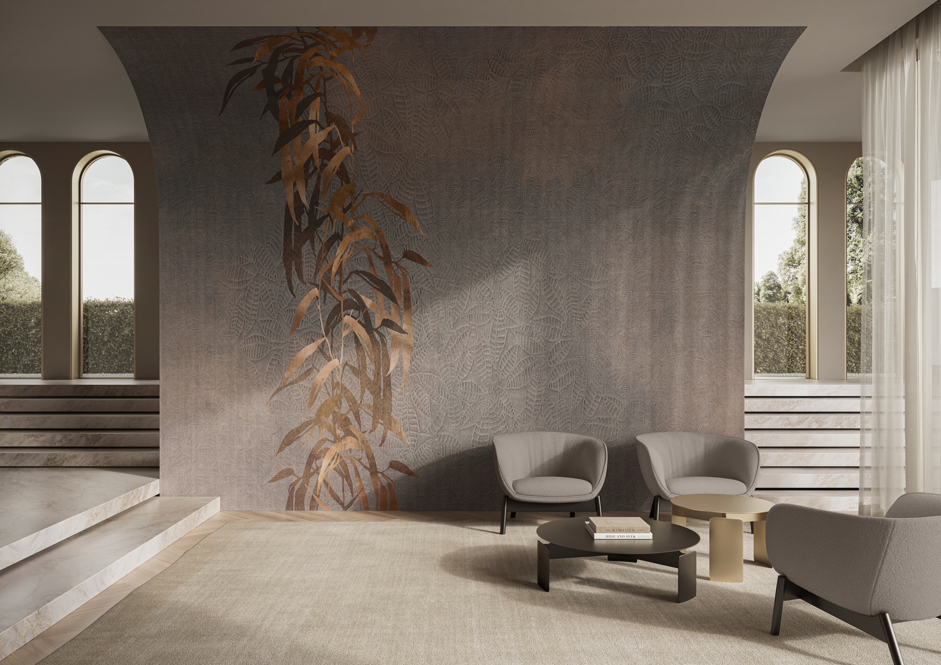 Tapeta GlamSatin je vyrobena ze speciálně vyvinutého materiálu, který zaujme svým nenápadným luxusem a leskem. Na neutrálním pozadí zemitých tónů ožívají botanické vzory v odstínech zlata, mosazi a platiny. Opulentní tropická zeleň, okvětní lístky a světlé rozkvetlé větve dodávají vnitřním prostorům jemnou a povzbuzující auru. Perleťový povrchivá úprava připomíná zářivý třpyt hedvábí. Speciální embosování odráží světlo, takže každý výtvarný prvek získává další vizuální rozměr.